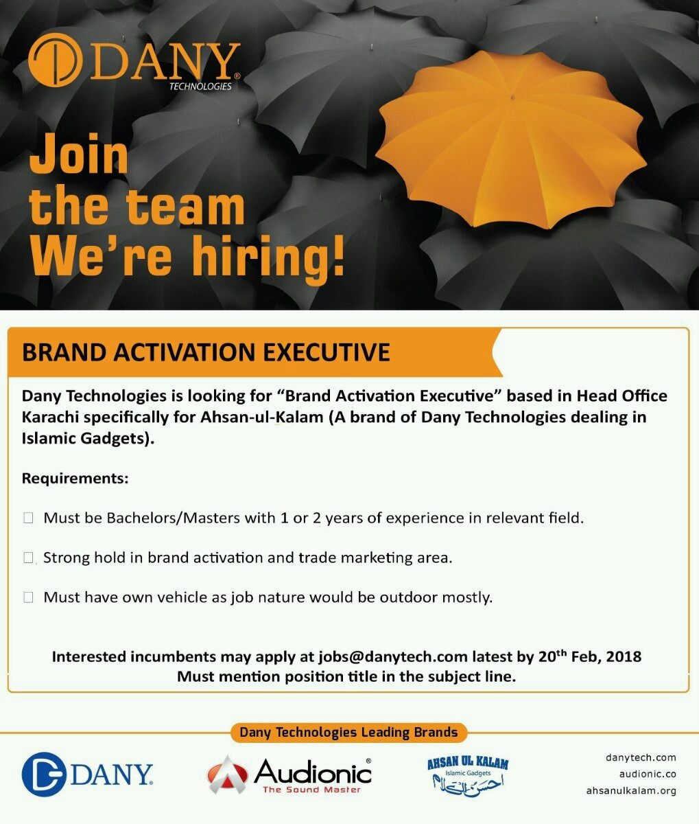 Dany Technologies is looking for Brand Activation Executive for its head office Karachi. Apply by sending your resume to jobs@danytech.com at latest by 20-February-2018.