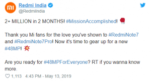 Last Month in April Redmi Announced that Note 7 series topped 1 million sales, and now it has passed 2 million. Just not a bad sale rate of 1 million units per month.