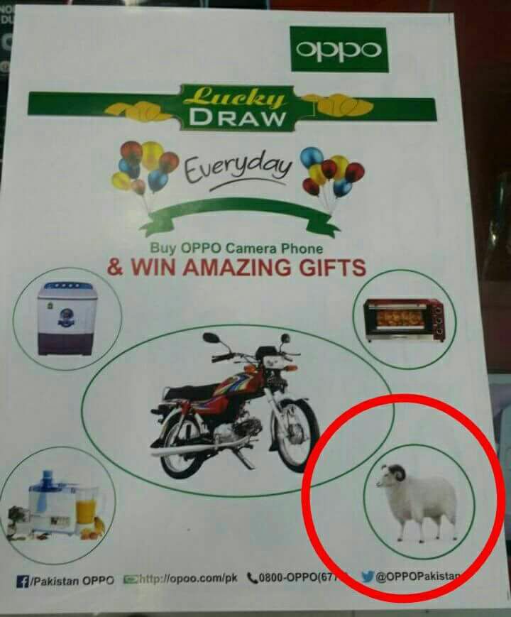 Oppo Mobile phone company offers Daily Lucky Draw- Bakra Eid Special offer This year Oppo has brought an interesting scheme. Buy Oppo Camera phone and win amazing gifts. The gifts include washing machines, motor bike, food factory, microwave ovens and the surprizingly “Barka”. Winners announced through daily lucky draws. So grab a phone and get a chance to be winner.