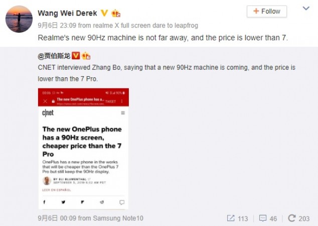 Wang Derek, Realme’s brand director, brought Weibo to verify that the 90Hz iphone screen is not very far back. Derek did not disclose any of this device’s requirements but said the onePlus 7 is smaller.