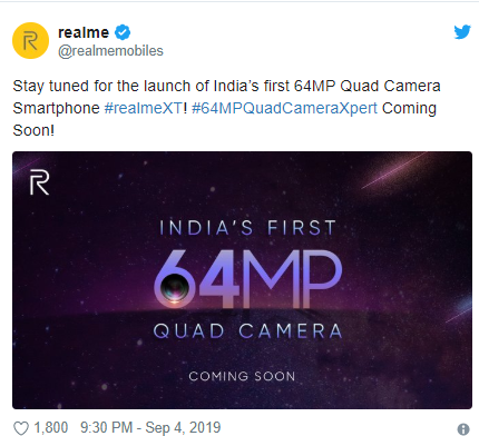 In Twitter Realme published a picture highlighting the XT as the first smartphone for India’s 64MP quad.
