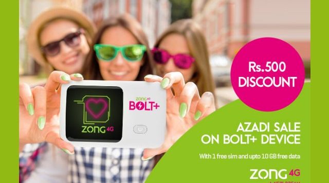 Azadi Sale: Along with this Zong announced Azadi Sale. This year, Zong offered Discount on Zong 4G Bolt+Devices. Now Zong customers can get this device on discounted price. Not only this Zong customers will also get free Zong SIM with up to 10 GB of Free Data.A special discount was announced as follows: Celebrate this Independence Day with Azadi Sale. Get exclusive discount of Rs.500 on Zong4G Bolt+ Device. BONUS: Get a Free SIM with up to 10GB of Free Data. The offer ends at midnight 15th August. Hurry up and order now: http://bit.ly/2vOVNYe