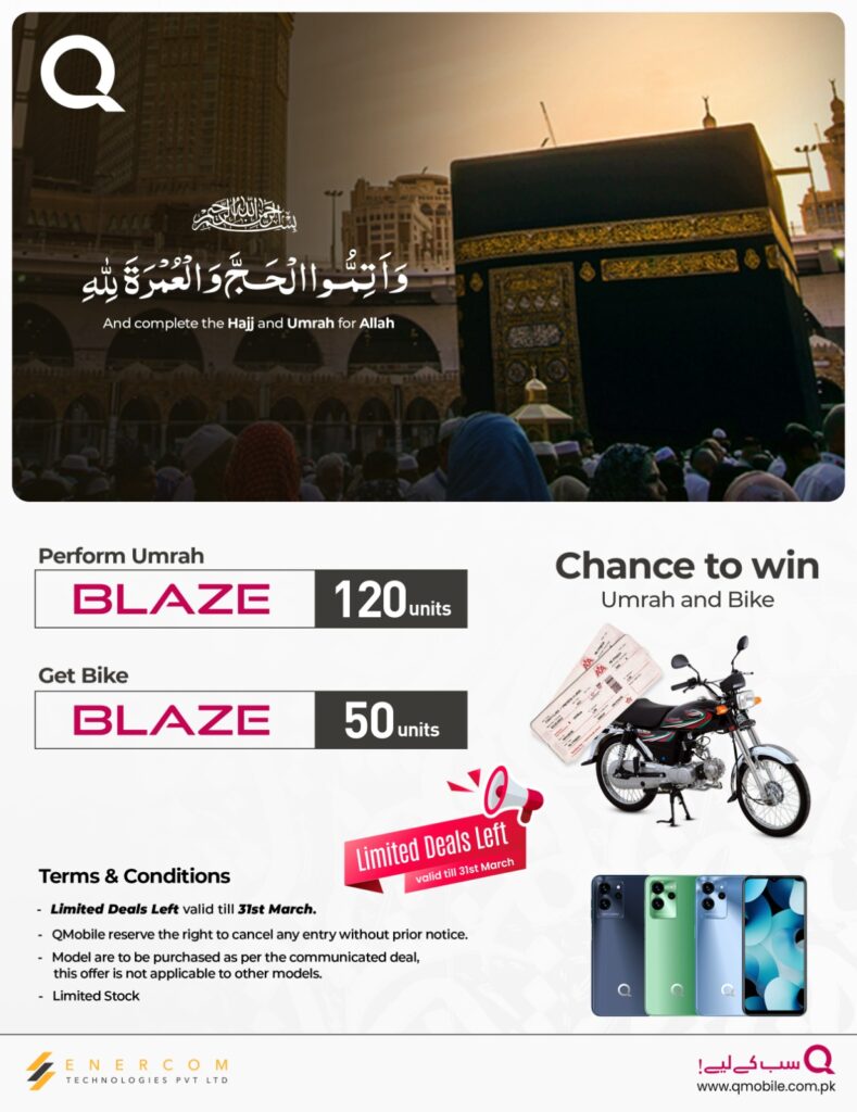 This Ramazan Qmobile is offering UMRAH and BIKE deals for dealers. Sell 120 units to qualify for Umrah deal Sell 50 units to qualify for Bike deal.